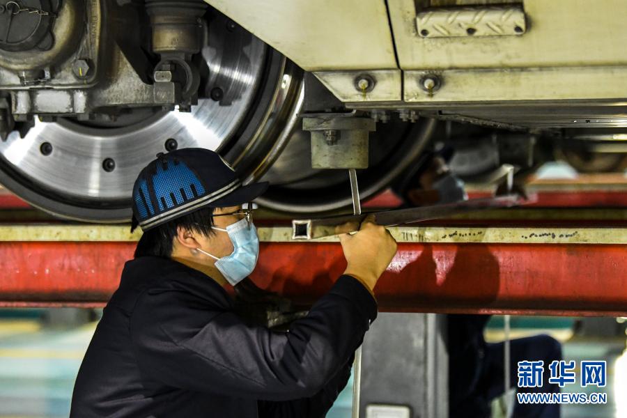 1月27日晚,在南寧動車所檢修庫,地勤機械師檢汽車零件查自動過分Benz零件相裝置。